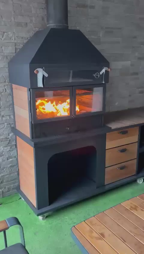 Engineered for serious outdoor entertainers, this premium wood-fired BBQ and kitchen station delivers the versatility of a traditional grill, the depth of a wood oven, and the practicality of a complete outdoor kitchen — all in a single freestanding unit.